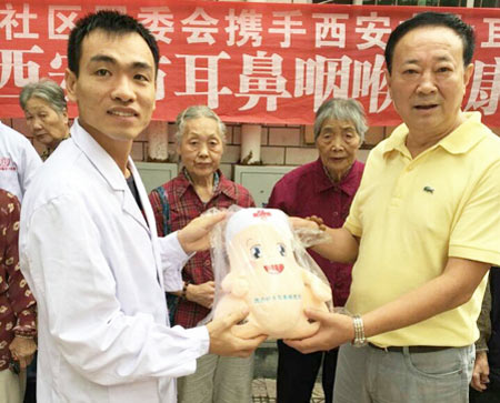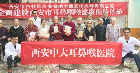 在义诊活动中,西安中大医护人员为老人细心诊断、耐心解疑,并现场为他们量血压、测血糖、采用内窥镜做耳鼻喉疾病检查,建立耳鼻喉健康档案。
