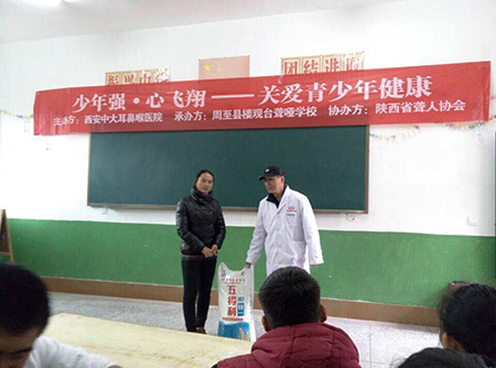“关注特殊儿童,传递爱心之举”。11月10日,由陕西聋人协会牵头,西安新城中大耳鼻喉医院志愿者一行在陕西省聋人协会贾双登主席的陪同下,前往周至县楼观台聋哑学校开展“少年强·心飞翔--关注青少年健康”活动。中大志愿者们对学生进行爱心授课,并向学校捐赠水杯、鼻子宝宝公仔、米面等“爱心物资”,给聋哑儿童送去关爱和温情。