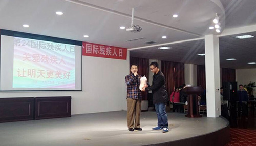 活动现场,肢协副主席严育斌、盲人协会主席魏国光、精残协会主席文萍、聋人协会主席贾双登、智障协会主席杨琪依次发表了讲话,向残疾人朋友传递关怀和鼓励。西安新城中大耳鼻喉医院院长送上祝福,预祝活动成功,并赠送了鼻子宝宝公仔礼品。